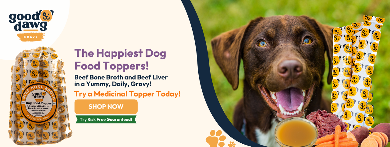 A dog food topper is a product you add to your dog's regular meals, typically meant to enhance the flavor and texture. Good Dawg Gravy toppers are crafted to taste great and provide the highest nutritional support available in the Food Topper Market. They are not meant to replace your dog's primary food, but rather to supplement it.