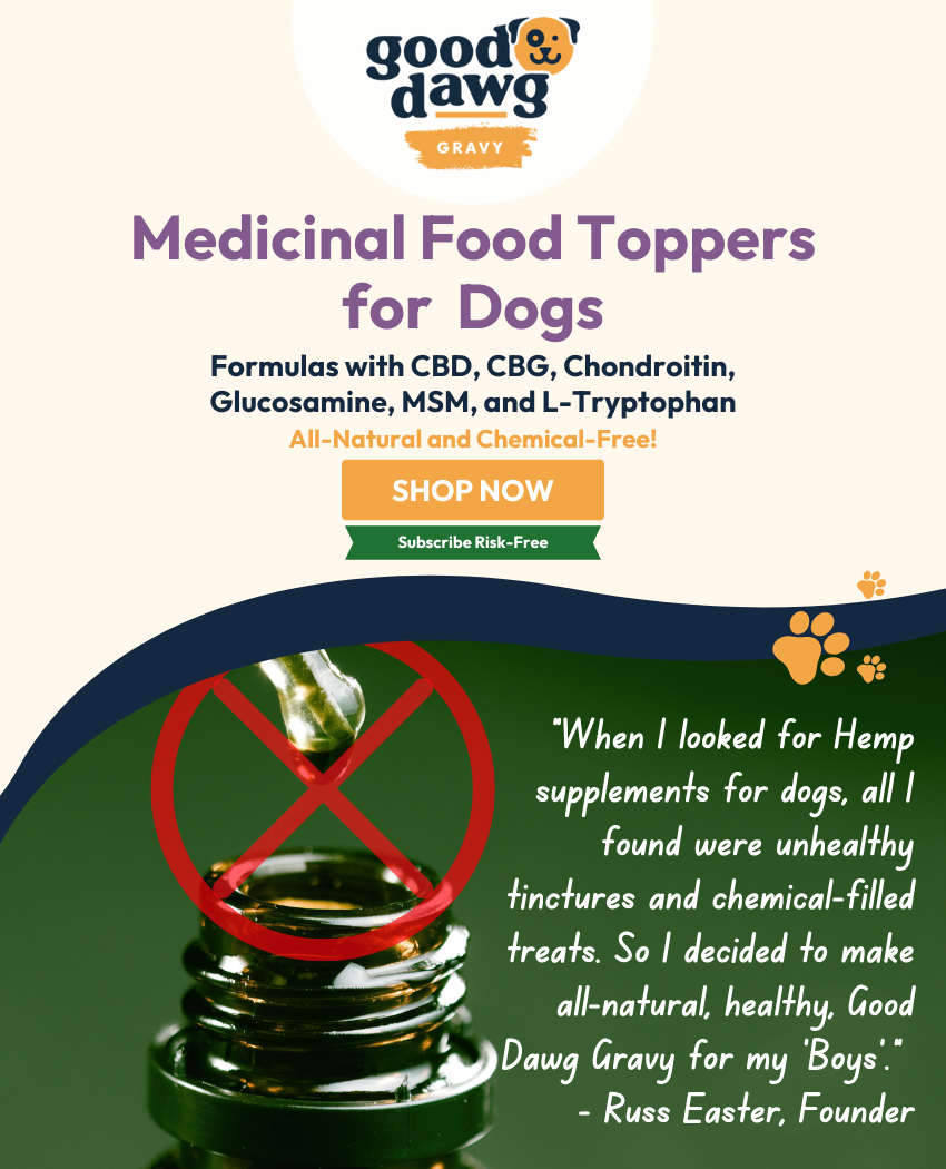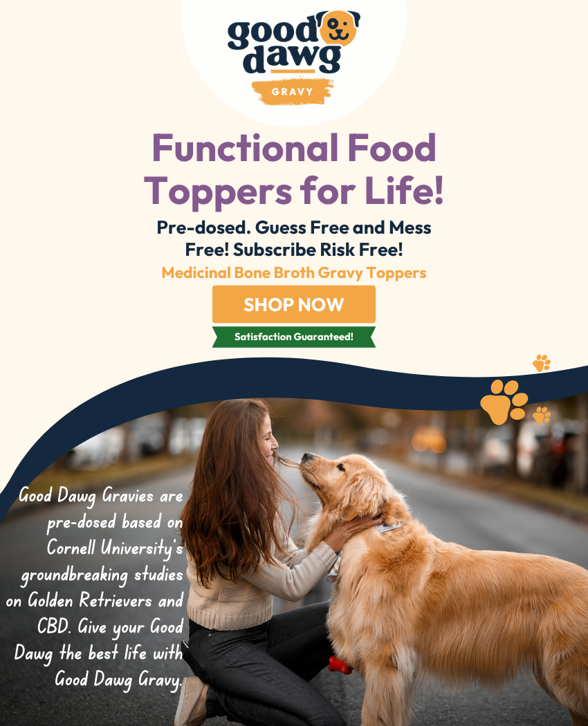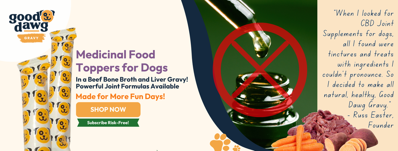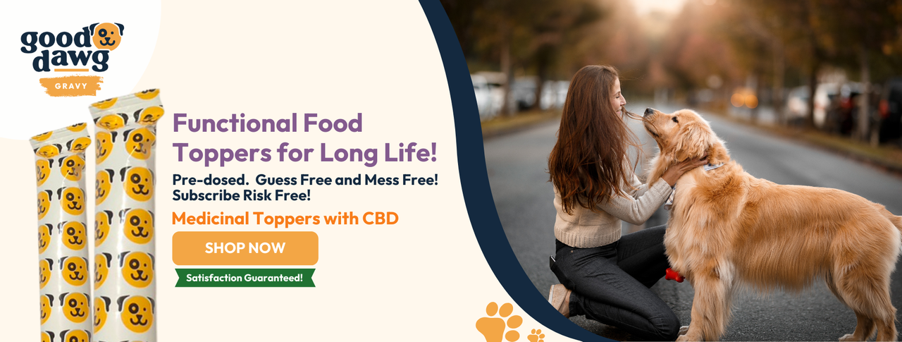 Dog food toppers like Good Dawg Gravy are designed to supplement a dog's diet with Core Longevity Supplements aimed at addressing health concerns such as joint pain and anxiety. For example, all 4 Good Dawg Gravy formulas help with joint pain, but our Senior Formula is specifically created with natural supplements that support healthy, pain-free mobility in aging dogs. Our Calming Formula contains Cannabidiol (CBD) to regulate stress and mood, and L-Tryptophan, an amino acid that helps the body produce serotonin, a neurotransmitter linked to well-being and emotional balance.